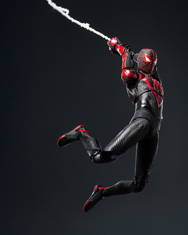 黒のスーツには赤いラインと立体的なメッシュ模様があしらわれ、胸と背中の大きな赤いスパイダーエンブレムは、ゲーム『Marvel’s Spider-Man 2』のデザインを忠実に再現。