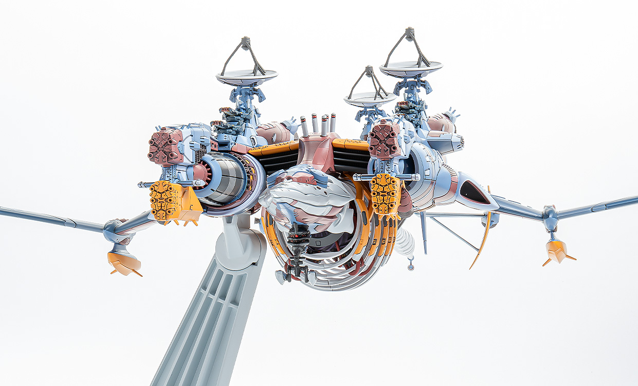 ・主砲およびアンテナは可動式。肋骨のような白い構造体と複雑な配管、そこに内包される主機の様子もつぶさに観察できます。