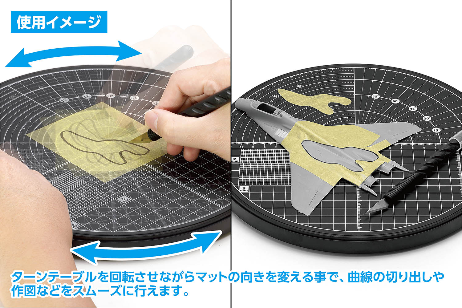 回転させながらマットの向きを変える事で、曲線の切り出しや作図などをスムーズに行えます。