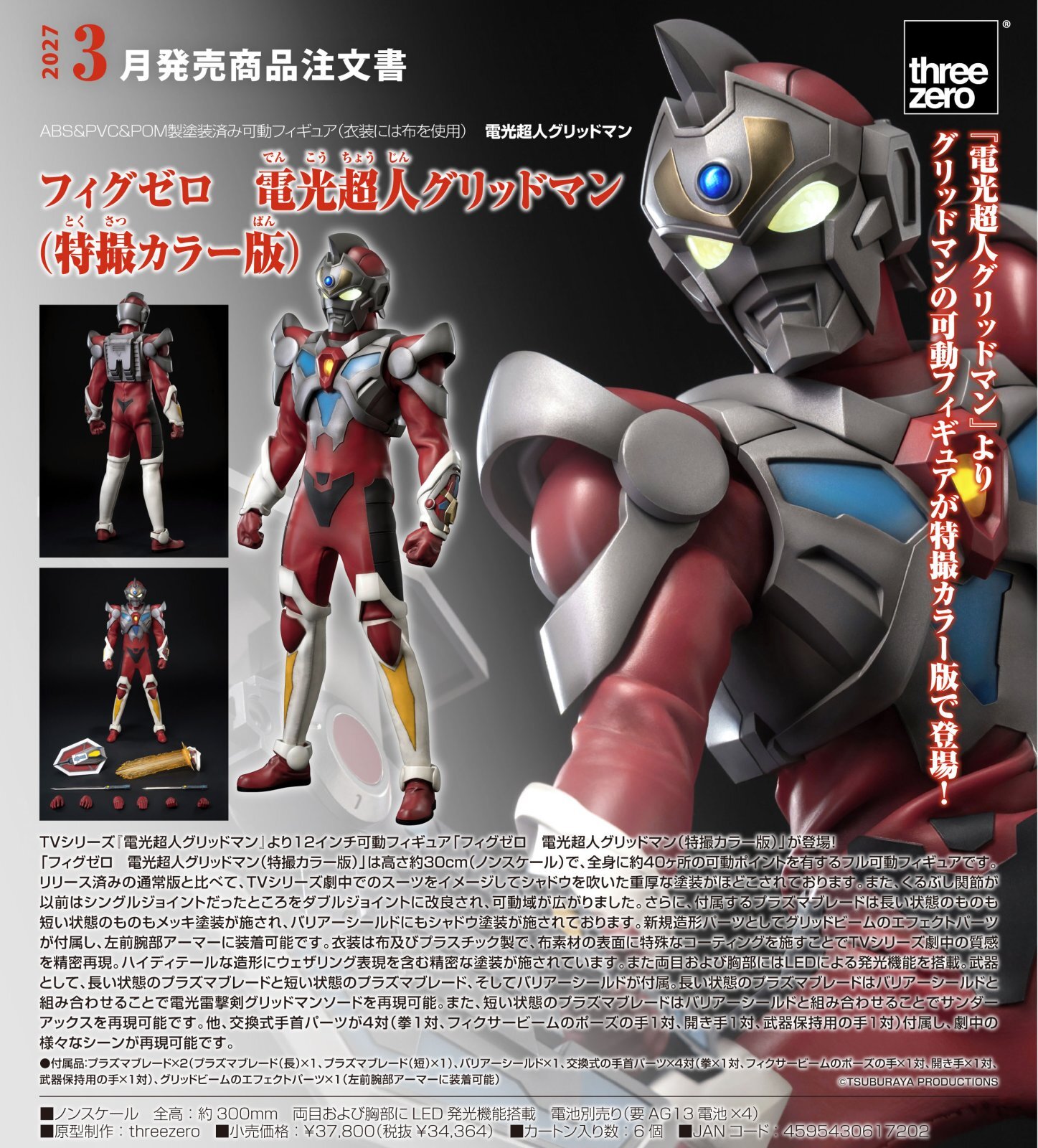 「フィグゼロ 電光超人グリッドマン(特撮カラー版)」は高さ約30cm(ノンスケール)で、全身に約40ヶ所の可動ポイントを有するフル可動フィギュアです。